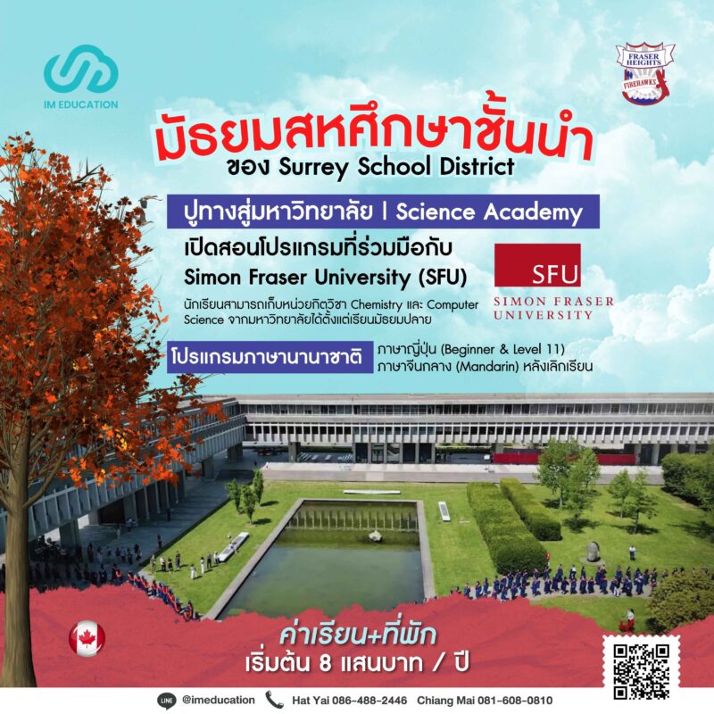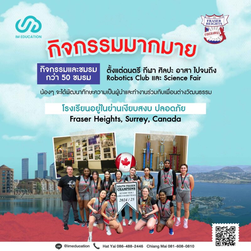 Fraser Heights เป็นโรงเรียนมัธยมสหศึกษา เปิดสอนตั้งแต่ Grade 8 ถึง Grade 12 มีนักเรียนประมาณ 1,600 คน โรงเรียนขึ้นชื่อด้านวิชาการและกิจกรรมเสริมที่หลากหลาย ตั้งแต่วิทยาศาสตร์ คณิตศาสตร์ ไปจนถึงศิลปะ ดนตรี กีฬา และหุ่นยนต์ ที่นี่นักเรียนไม่เพียงแต่เรียนในห้องเรียน แต่ยังได้มีโอกาสพัฒนาทักษะด้านความคิดสร้างสรรค์ การทำงานเป็นทีม และการแก้ปัญหาเชิงลึก ซึ่งถือเป็นพื้นฐานสำคัญสำหรับการเรียนต่อในระดับมหาวิทยาลัย สำหรับนักเรียนต่างชาติ ค่าเรียนพร้อมที่พักต่อปีเริ่มต้นที่ประมาณ 800,000 บาท ทำให้น้องๆ ได้ทั้งการเรียนคุณภาพและการใช้ชีวิตในสภาพแวดล้อมที่ปลอดภัยและเอื้อต่อการพัฒนาตัวเอง